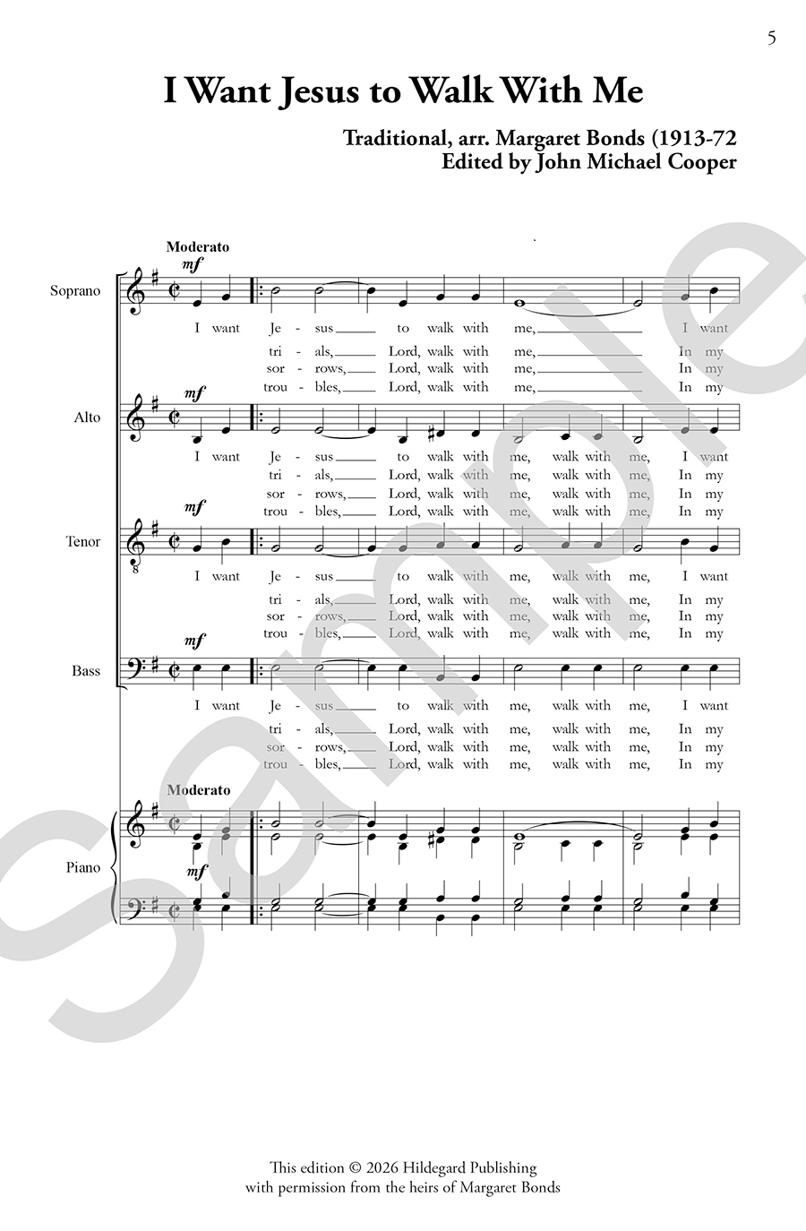 Margaret Bonds composed this piece in the 1950s. She indicated on the title page of the autograph that it was written “for seventh and eighth grades” (i.e., children ages 12-14 years). In keeping with the target ages, the setting is not difficult, but Bonds’s use of imitative responses between phrases is suggestive of the call-and-response texture typical of African and African American vernacular music. Accessible for choirs of all ages and skill.