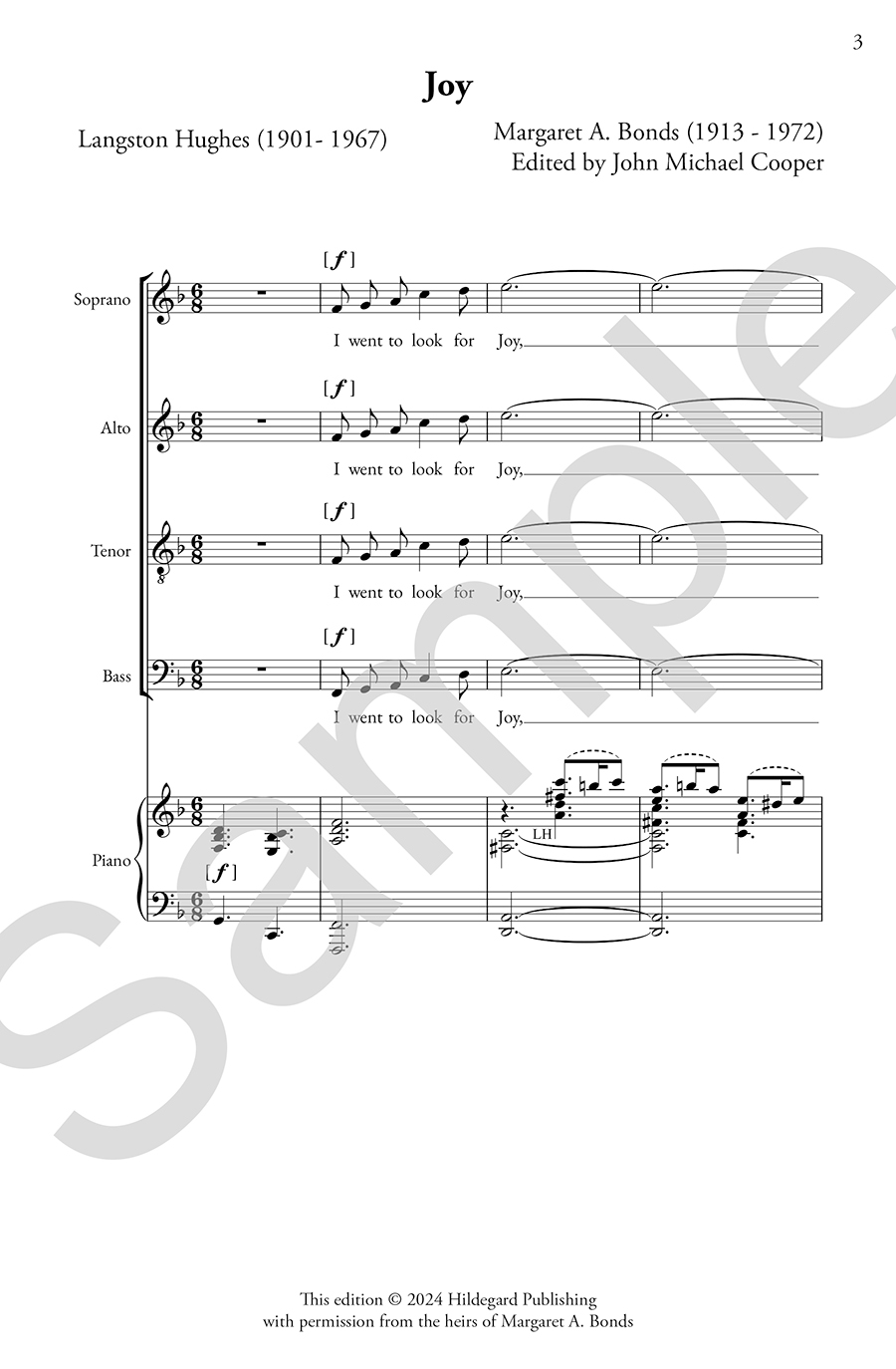 Margaret Bonds described this work as the first choral composition written expressly for the George McClain Chorale. In her own words, “the choir needed a light, gay composition. I knew Langston Hughes poem, ‘Joy’ so well that I whipped out a piece of manuscript paper and started setting the poem right on the counter. In two days I had it finished… The music of ‘Joy’ expresses the joy that I felt in my association with the young conductor who loves music as much as I do”.