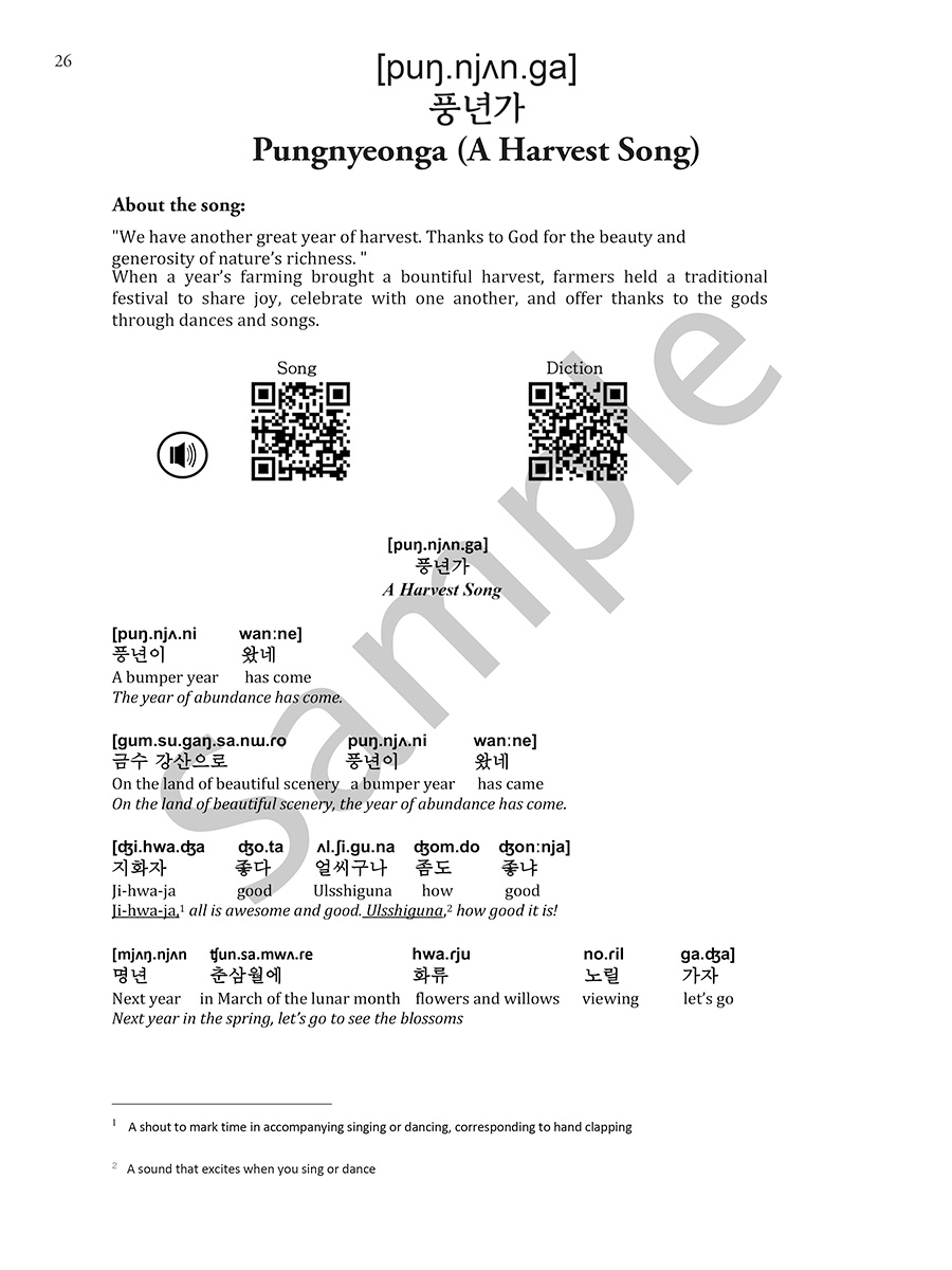 This groundbreaking collection of Korean songs includes background information, translations, IPA guides and QR codes linking to recordings of each song as well as the text pronunciation. Soprano Raejin Lee and composer Jean Ahn have collected traditional Korean folk songs in collaboration with traditional folk singers. They then reinterpreted the songs for voice and piano. The resources included in the collection allow non-Korean speaking singers to learn and perform the songs and reach beyond the cultural boundaries of traditional vocal repertoire.
