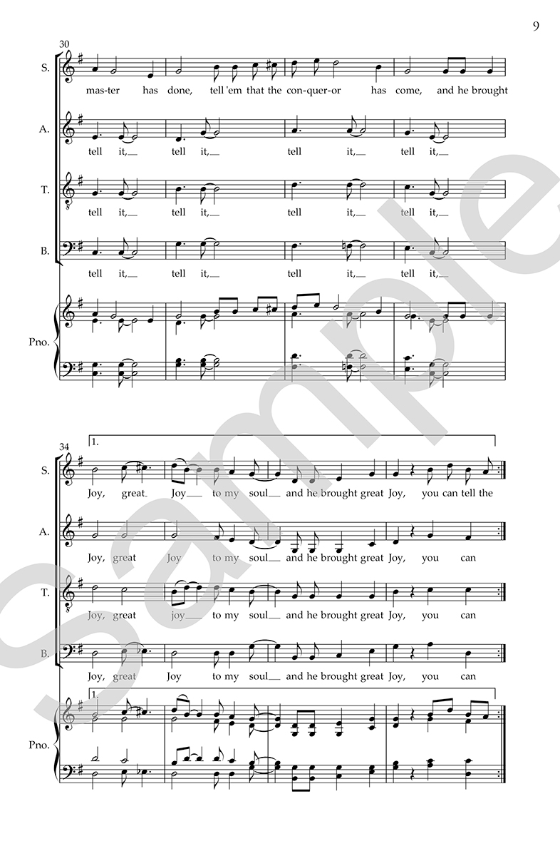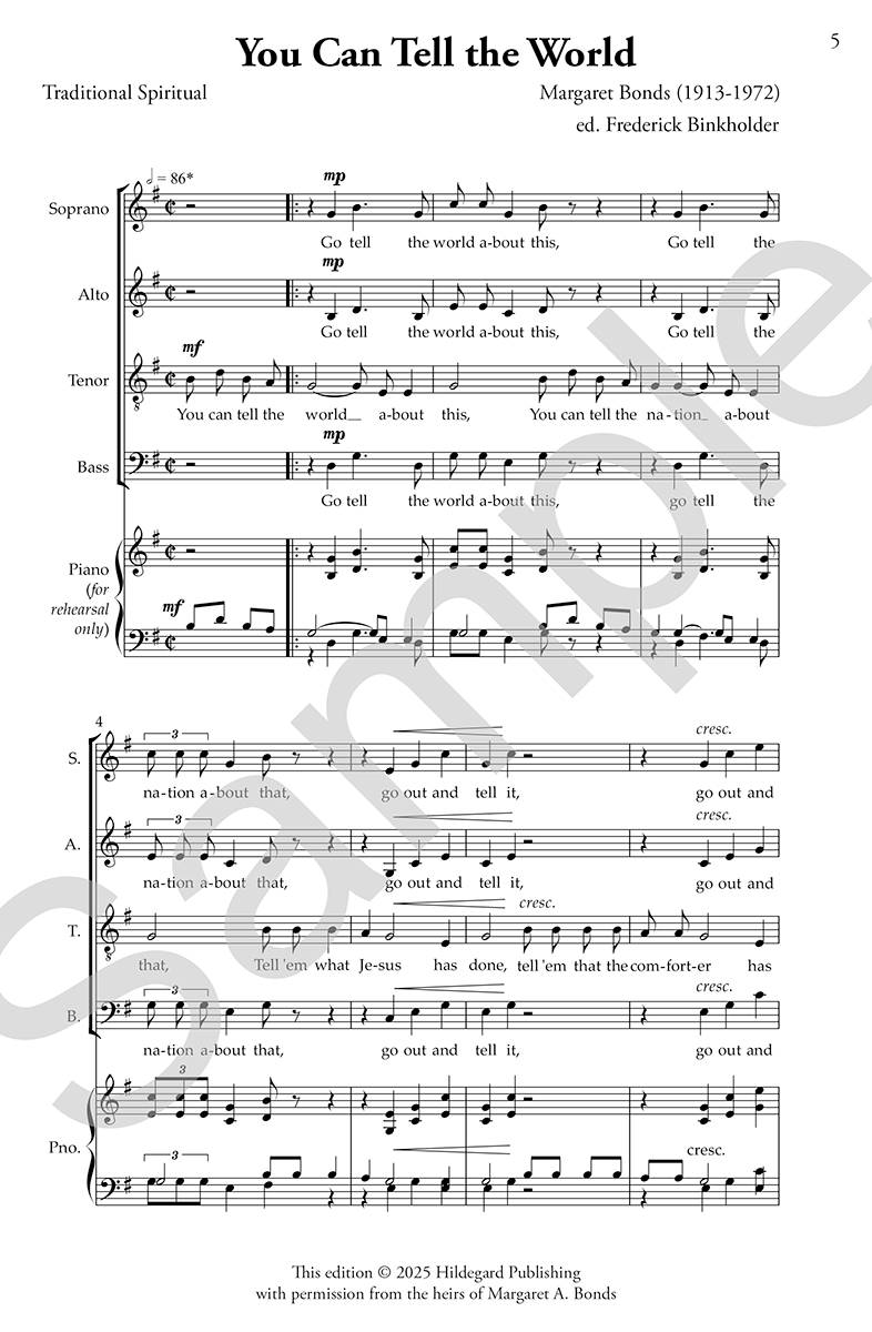The spiritual You Can Tell the World was fertile ground for Margaret Bonds’ compositional genius. She first arranged it for solo voice and piano, then went on to write an orchestrated version for solo voice, and a number of choral settings. (for the SSA version see 392-03117)